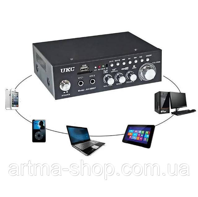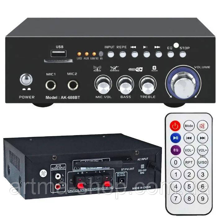 Двоканальний підсилювач потужності звуку з USB та Bluetooth, AMP 688 BT 2CH Музичний підсилювач звуку